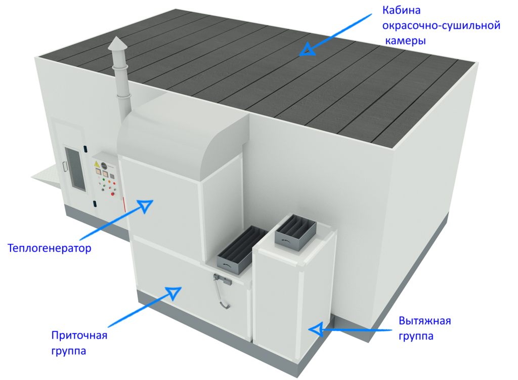 Кабина окрасочно-сушильной камеры представляет из себя набор сэндвич панелей, укрепленных поперечными и продольными стальными балками. В верхней части кабины расположены фильтра тонкой очистки, которые являются последней ступенью очистки перед попаданием воздуха в кабину. В напольной части расположены фильтра грубой очистки для предотвращения попадания крупных частиц в вытяжной блок. Для въезда автомобиля фронтальная часть кабины оборудована большими трехстворчатыми воротами со смотровыми окнами. Для доступа персонала предусмотрена сервисная дверь со смотровым окном и системой «антипаника». Сервисная дверь может устанавливаться с любой стороны непосредственно в ходе монтажа.